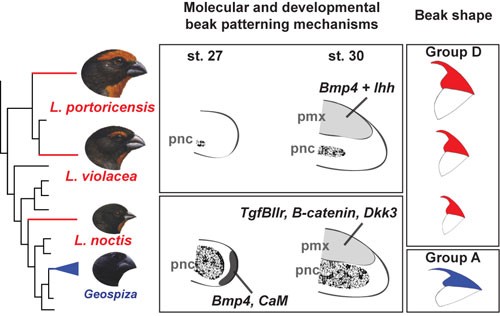 - All three species of Loxigilla (in red) have the same beak shape. However L. noctis is more closely related to Darwin’s finches (Geospiza) than it is to other Loxigilla. Thus, this beak shape has evolved at least twice. In agreement with phylogeny, Loxigilla noctis shares the same beak developmental pathway as Geospiza.